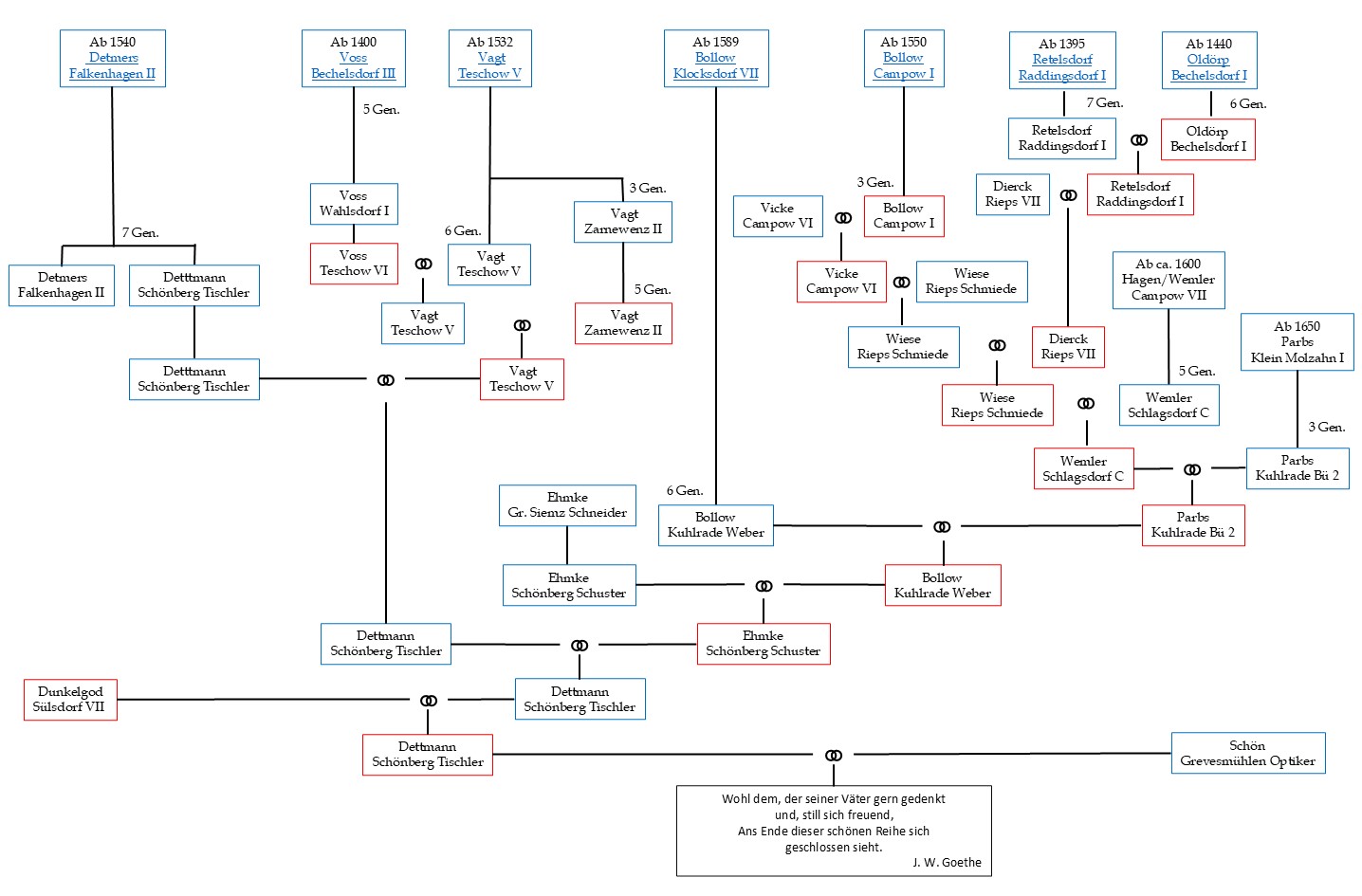 Das unten von mir entworfene Diagramm zeigt in zusammenfassender und übersichtlicher Form die Vorfahren Struktur von meiner Familie, was die Dettmann-Seite aus Schönberg betrifft. Ich denke es ist einmalig, wie weit sich die einzelnen Zweige des Familienbaumes zurückverfolgen lassen. Und es gibt hier eine Verknüpfung der einzelnen Familien über einen großen Teil des Ratzeburger Landes.