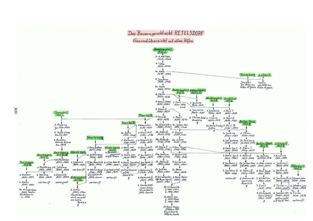 Die Familiengeschichte der Retelsdorf wurde von Herrn Oberförster a.D. Martin W. Krüger „Familie Retelsdorf die Chronik eines alten Bauerngeschlechts – Eine Familiengeschichte von über 560 Jahren“ sehr umfangreich und gut recherchiert niedergeschrieben. Leider ist diese Schrift im Selbstverlag entstanden und damit nicht öffentlich zugänglich. Ich habe jetzt mit Herrn Krüger gesprochen. Wir wollen diese Chronik auf dieser Seite öffentlich zugänglich machen. Unter dem Menüpunkt „ Familie Retelsdorf“ ist die Chronik als PDF-Dokument verfügbar.